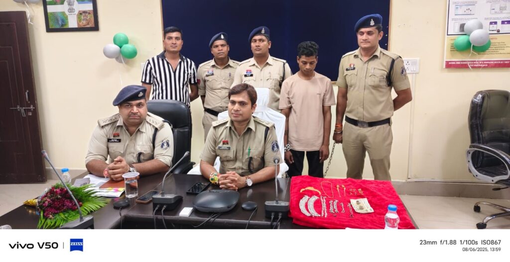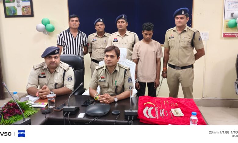 आल्मारी में रखे घर नगदी रकम 14,000 रू एवं पत्नी का सोने का नेकलेस, रानीहार, अगुठी, झुमका, चैन, बाली, टॉप्स, 03 नग पायल एवं फुल्ली कीमती 66,000 रूपये कुल कीमती 80,000 रूपये को अज्ञात चोर द्वारा चोरी कर ले गया है। रिपोर्ट पर थाना सिटी कोतवाली मुंगेली में अपराध क्रमांक 359/25 थारा 331 (4) 305 (ए) बी0एन0एस पंजीबद्ध कर विवेचना में लिया गया। विवेचना के दौरान नगर के विभिन्न स्थानों पर लगे सीसीटीव्ही अवलोकन, मुखबीर सूचना तंत्र एवं टेक्निकल साक्ष्य के आधार पर पुलिस टीम द्वारा खरीपारा के पास घेराबंदी कर आरोपी अंकित सारथी एवं एक नाबालिग बालक को हिरासत में लेकर तथ्यात्मक पूछताछ करने पर आरोपियों द्वारा अपराध घटित करना स्वीकार कर किये जो दिनांक 03.08.2025 को सूना मकान देखकर दोनो घर के बगल मे बाथरूम में चढ़कर छत में चढ़े फिर छत का दरवाजा खुला होने से घर अंदर जाकर आलमारी के लॉकर को हसिया से तोड़कर मशरूका चोरी कर ले जाकर सोने चांदी को मोर छत्तीसगढ़ ढ़ाबा के पीछे जमीन अंदर दबाकर अमरकंटक घुमने जाने बताये। आरोपी व नाबालिग बालक के निशादेही पर मोर छत्तीसगढ़ ढाबा के पीछे जमीन के अंदर दबाकर रखे चोरी गये मशरूका सोने एवं चांदी के जेवरात नेकलेस, अंगुठी, झुमका, चैन, बाली, टॉप्स, 03 नग पायल एवं फुल्ली कीमती 66,000 रूपये को जप्त एवं नगदी रकम 1000 रूपये व शेष 13000 रूपये को अमरकंटक घुमने मे खर्च होना बताये जुमला 67,000 रूपये को जप्त कर आरोपी अंकित सारथी पिता लाखन सारथी उम्र 20 वर्ष निवासी खरीपारा विनोबा भावे वार्ड मुंगेली थाना सिटी कोतवाली आरोपियों के विरूद्धअपराध क्रमांक 359/25 धारा 331(4), 305 (ए) बीएनएस के तहत गिरफ्तार कर ज्यूडिशियल रिमाण्ड पर भेजा गया। व विधि से संघर्षरत् 01 बालक के द्वारा चोरी की घटना में शामिल होना पाये जाने पर विधि से संघर्षरत बालक को बाल संप्रेक्षण गृह भेजा गया एवं 01 संदेही आरोपी फरार है, जिसकी पतासाजी जारी है।