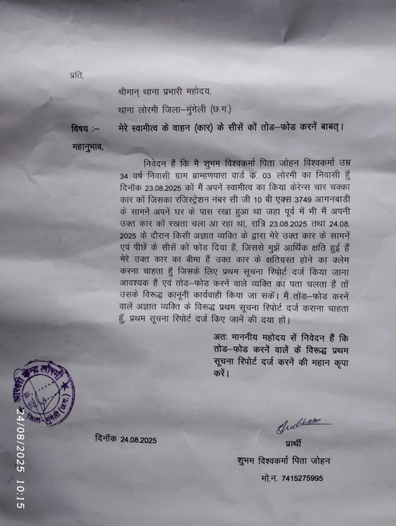हरिपथ;लोरमी– 24 अगस्त नगर के ब्राह्मण पारा मोहल्ले में वार्ड 3 में एक महंगी kia कार में असामाजिक तत्वों ने आगे पीछे शीशे को तोड़फोड़ करने का मामला प्रकाश में आया है। पीड़ित ने थाने में अज्ञात तत्वों के खिलाफ लिखित शिकायत दर्ज कराई है।