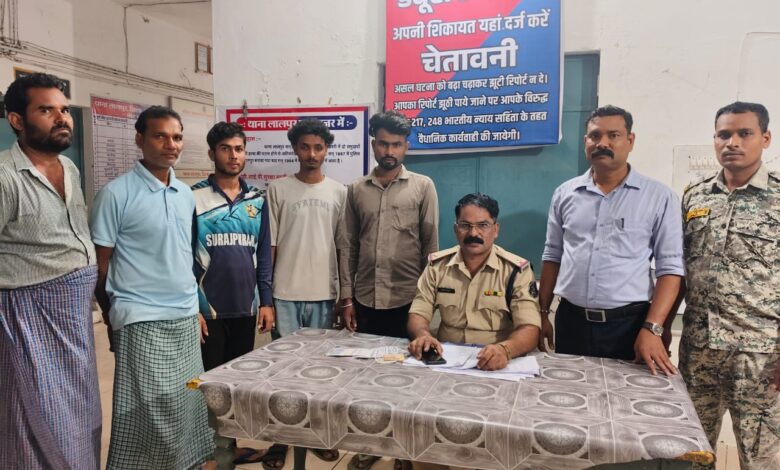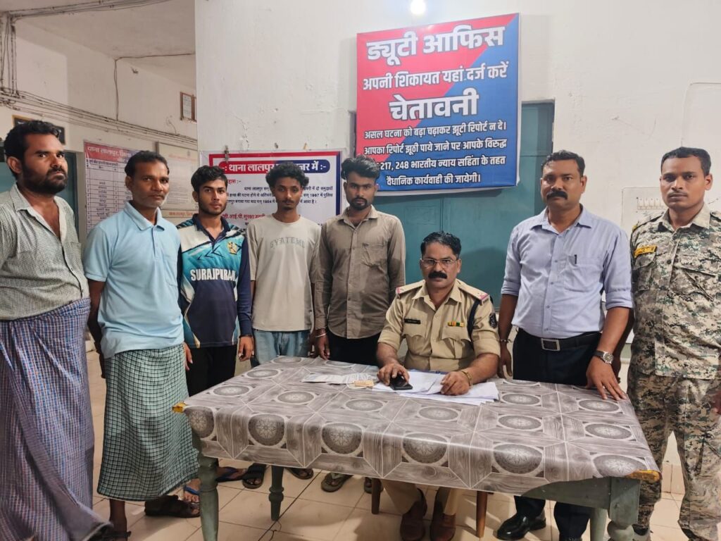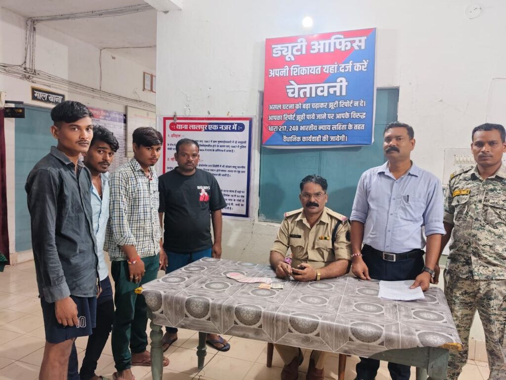 थाना लालपुर क्षेत्रान्तर्गत ग्राम मनोहरपुर के पास 52 पत्ती ताश से रूपये पैसे का दांव लगाकर जुआड़ियान 1.अंकित यादव पिता जल सिंह उम्र 25 वर्ष निवासी गोड़खाम्ही थाना लोरमी 2.मनोज कुमार टंडन पिता पुरूषोत्तम उम्र 38 वर्ष 3.भास्कर बंजारा पिता तिरिथराम उम्र 38 वर्ष निवासी बरबसपुर थाना लोरमी 4.हीराप्रसाद टोण्डे पिता उमेंद दास उम्र 40 वर्ष निवासी बरबसपुर 5.गणेश राम साहू पिता हगरू उम्र 50 वर्ष 6.राजकुमार टंडन पिता हेमंत उम्र 25 वर्ष 7.नवीन पात्रे पिता माधरी प्रसाद उम्र 26 वर्ष तीनो निवासी मनोहरपुर थाना लालपुर 8.संतोष कोशले पिता बलीराम उम्र 35 वर्ष को जुआ खेलते पकड़ा गया जिनसे 02 प्रकरण मे फड़ एवं पास से जुमला नगदी 5000 रूपये जप्त किया गया। साथ ही ग्राम सुरजपुरा मे जुआ खेलते जुआड़ियान 1.दिलीप खुंटे पिता लोकनाथ उम्र 40 वर्ष 2.रामेश्वर खुंटे पिता भुवन उम्र 18 वर्ष 3.रितेश दिवाकर पिता जितु उम्र 22 वर्ष 4.संजीव खांडे पिता विजय कुमार उम्र 23 वर्ष 5.लोभन खुंटे पिता भुवन उम्र 22 वर्ष 6.विनोद कुमार पिता लोकनाथ उम्र 42 वर्ष 7.तलेश्वर खुंटे पिता गोविंदराम उम्र 28 वर्ष 8.पालसिंह कुर्रे पिता स्व.तितरा उम्र 37 वर्ष 9.कमल दिवाकर पिता रतीराम उम्र 45 वर्ष 10.गुलशन कोशले पिता छोटेलाल उम्र 25 वर्ष 11.रंजीत खुंटे पिता तिलौंजी उम्र 20 वर्ष 12.लक्ष्मण खूंटे पिता दिलीप उम्र 20 वर्ष 13.अरविन्द नवरंग पिता निरंजन उम्र 35 वर्ष सभी निवासी सुरजपुरा थाना लालपुर को पकड़े जिनसे 03 प्रकरण मे जुमला 3810 रूपये जप्त किया गया।