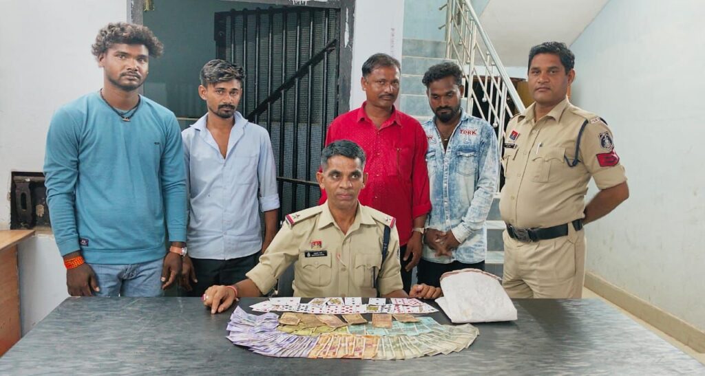 थाना सिटी कोतवाली मुंगेली क्षेत्रान्तर्गत ग्राम भटगांव मे जुआड़ियान 1.शंकर साहू पिता परसुराम उम्र 40 वर्ष निवासी चमारी 2.रंजीत धु्रव पिता प्रकाश चंद्र उम्र 23 वर्ष निवासी तुलसीकापा 3.लार्ड लियेन्डर मोहले पिता कन्हैया लाल उम्र 21 वर्ष निवासी भटगांव 4.संजय साहू पिता नरबद उम्र 35 वर्ष निवासी भटगांव थाना सिटी कोतवाली के फड़ एवं पास से नगदी 8260 रूपये, 52 पत्ती ताश जप्त किया गया।