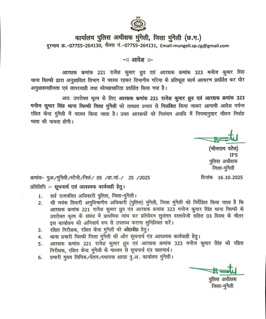 हरिपथ:मुंगेली/लोरमी– 17 अक्टूबर पुलिस अधीक्षक भोजराम पटेल (भा.पु.से.) ने कर्तव्य के प्रति लापरवाही करने वाले 02 आरक्षकों को किया सस्पेंड