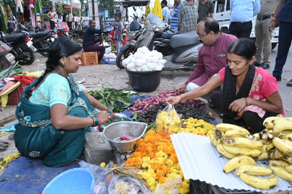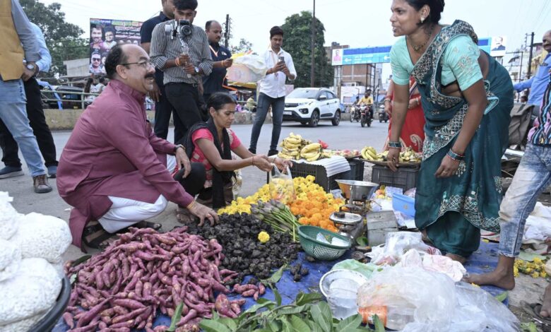 टिकरापारा के मुख्य मार्ग में बैठे छोटे व्यापारियों से डिप्टी सीएम साव ने पूजा सामग्री और फल- फूल खरीदे,