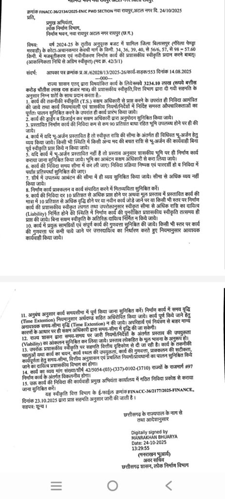 हरिपथ:लोरमी-25 अक्टूबर क्षेत्रीय विधायक एवँ उपमुख्यमंत्री अरुण साव की अनुशंसा पर मुख अभियंता, लोक निर्माण विभाग ने वर्ष 2024-25 के तृतीय अनुपूरक बजट में शामिल जिला बिलासपुर (गौरेला पेण्ड्रा मरवाही) के एवं लोरमी विधानसभा के अचानकमार , अमरकंटक,छपरवा,लमनी, केंवची मार्ग के किमी. 34, 36, 39, 40, से 56/6, 57, से 98 = 57.60 किमी. में मजबूतीकरण एवं नवीनीकरण निर्माण कार्य की प्रशासकीय स्वीकृति के पश्चात (आकस्मिकता निधि से अग्रिम स्वीकृत)राज्य शासन एतद् द्वारा विषयांकित कार्य के लिये 3234.10 लाख ( बत्तीस करोड़ चौतीस लाख दस हजार मात्र) की प्रशासकीय स्वीकृति, वित्त विभाग ने स्वीकृति प्रदान किया है।