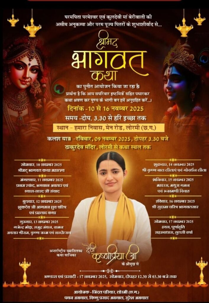 आयोजक पवन अग्रवाल ने बताया कि कलश यात्रा – रविवार, 09 नवम्बर 2025, दोपहर 3.30 बजे ठाकुरदेव मंदिर, लोरमी से कथा स्थल तक, सोमवार, 10 नवम्बर 2025 श्रीमद् भागवत कथा महात्म्य ,मंगलवार, 11 नवम्बर 2025 प्रथम स्कंद, भगवान अवतार एवं व्यास-नारद जी संवाद, बुधवार, 12 नवम्बर 2025 शुकदेव जी आगमन ध्रुव चरित्र एवं प्रहलाद कथा, गुरुवार, 13 नवम्बर 2025 गजेन्द्र मोक्ष, समुद्र मंथन, वामन अवतार श्रीराम, कृष्ण जन्म एवं नन्दोत्सव, शुक्रवार, 14 नवम्बर 2025 श्री कृष्ण बाल लीलाएं एवं गोवर्धन लीला, शनिवार, 15 नवम्बर 2025 महारस, मथुरा गमन एवं रूखमणी विवाह,रविवार, 16 नवम्बर 2025 श्री सुदामा चरित्र भागवतसार,सोमवार, 17 नवम्बर 2025 हवन, पूर्णाहूति सहस्त्राधारा, तुलसी वर्षा,भण्डारा एवं प्रसादी 17 नवम्बर 2025, सोमवार, दोपहर 12.30 से 03.30 तक रहेगा। कार्यक्रम को सफल बनाने विष्णु अग्रवाल, सुरेश एवं रिंकू अग्रवाल जुटे है।