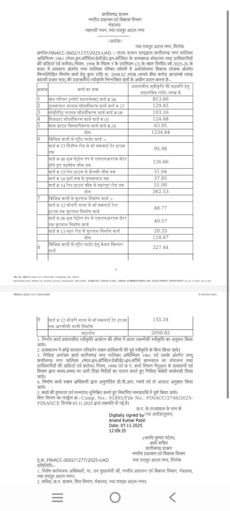 राज्य शासन एतद द्वारा छत्तीसगढ़ नगर पालिका अधिनियम 1961 (मेयर-इन-कौंसिल/प्रेसीडेंट-इन-कौंसिल के कामकाज संचालन तथा प्राधिकारियों की शक्तियां एवं कर्तव्य) नियम, 1998 के नियम 5 के उपनियम (2) के तहत वित्तीय वर्ष 2025-26 के बजट में प्रावधान अंतर्गत नगर पालिका परिषद लोरमी में अधोसंरचना विकास योजना अंतर्गत निम्नलिखित निर्माण कार्य हेतु कुल राशि रू. 2098.82 लाख (रूपये बीस करोड़ अन्ठानबे लाख बयासी हजार मात्र) की प्रशासकीय स्वीकृति निम्नांकित शर्तों के अधीन प्रदान किया गया।