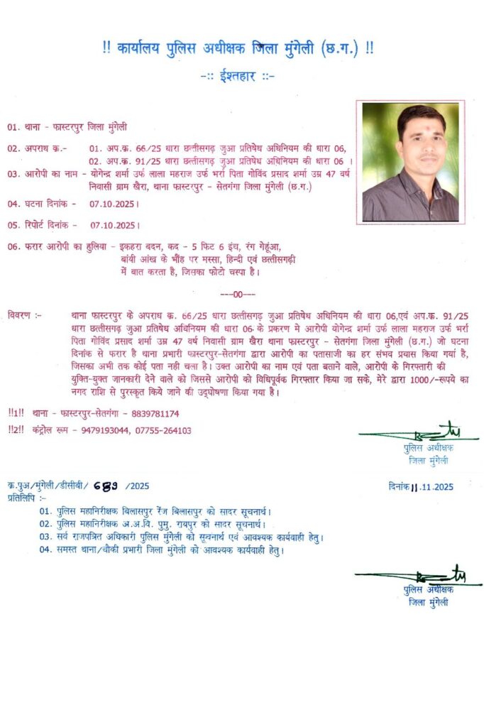 थाना फास्टरपुर के अपराध क्रमांक 66/25 धारा छत्तीसगढ़ जुआ प्रतिषेध अधिनियम की धारा 06, एवं अपराध क्रमांक 91/25 धारा छत्तीसगढ़ जुआ प्रतिषेध अधिनियम की धारा 06 प्रकरण के सट्टा खाईवाल आरोपी योगेन्द्र शर्मा उर्फ लाला महराज उर्फ भर्रा पिता गोविंद प्रसाद शर्मा उम्र 47 वर्ष निवासी ग्राम खैरा थाना फास्टरपुर सेतगंगा जिला मुंगेली (छ.ग.) जो घटना दिनांक 07.10.2025 से ही फरार है। थाना प्रभारी फास्टरपुर -सेतगंगा द्वारा आरोपी का पतासाजी का हर संभव प्रयास किया गया है, जिसका अभी तक कोई पता नही चला है। उक्त आरोपी का नाम एवं पता बताने वाले, आरोपी के गिरफ्तारी की युक्ति-युक्त जानकारी देने वाले को जिससे आरोपी को विधिपूर्वक गिरफ्तार किया जा सके, मुंगेली पुलिस अधीक्षक द्वारा 1000/-रूपये (एक हजार रूपये) नगद राशि से पुरस्कृत किये जाने की उद्घोषणा किया गया है।
