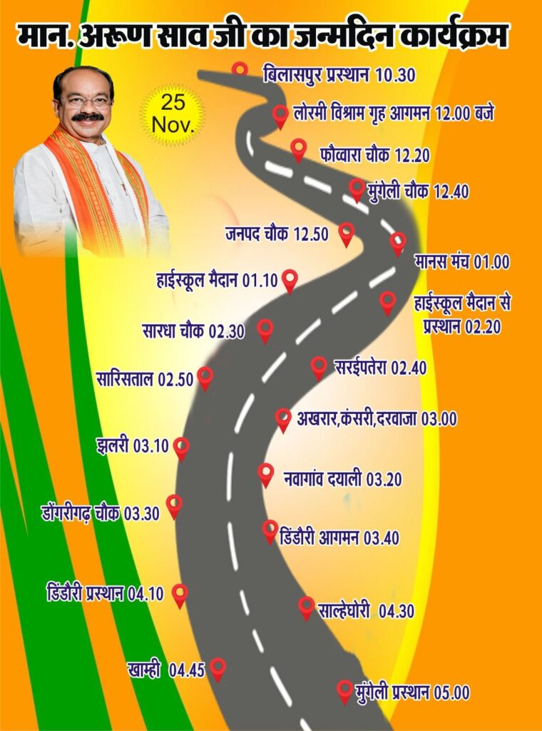 अरुण साव का जन्मोत्सव कार्यक्रम 25 नवंबर को हाई स्कूल मैदान लोरमी में दोपहर 12 बजे एवं ग्राम डिंडौरी बाजार में दोपहर 3 बजे पहुँचेंगे। वह बिलासपुर से कोटा होते हुए लोरमी आगमन दोपहर 12 बजे एवं नगर में स्वागत, हाईस्कूल मैदान में मंचीय कार्यक्रम पश्चात् दोपहर 2 बजे लोरमी से ग्राम डिंडौरी बाजार के लिए प्रस्थान~ग्राम सारधा दोप.2.10 बजे,ग्राम सरईपतेरा दोप.2.20 बजे,ग्राम सारिसताल दोप.2.30 बजे,ग्राम अखरार कंसरी दरवाजा संयुक्त रूप से डोंगरीगढ़ मोड़ रामूनगर अखरार दोप.2.40 बजे,ग्राम झलरी दोप.2.50 बजे, ग्राम नवागांव दयाली मोड़ दोप.3.00 बजे,ग्राम डोंगरीगढ़ दोप.3.10 बजे तथा *ग्राम डिंडौरी दोप.3.20 आगमन एवं स्वागत, साइकिल वितरण कार्यक्रम* पश्चात डिंडौरी से प्रस्थान शाम 4.00 बजे, ग्राम तिलकपुर आगमन शाम4.05 बजे,ग्राम मनकी शाम 4.10 बजे,ग्राम साल्हेघोरी शाम 4.20 बजे,ग्राम अमलडीही शाम 4.30 बजे, ग्राम खामही शाम 4.40 बजे आगमन एवं प्रस्थान होगा।