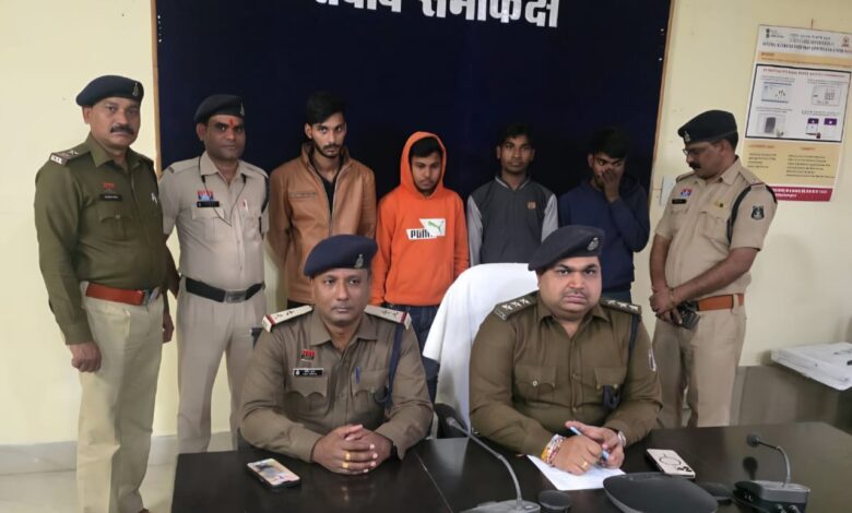 गिरफ्तार आरोपी – 1.समीर भास्कर पिता बुधरूदास भास्कर उम्र 20 वर्ष 2. देवप्रसाद माथुर पिता मनोज माथुर उम्र 19 वर्ष 3. इन्द्रेश उर्फ सुरज बंजारे पिता माखन बंजारे उम्र 20 वर्ष सभी साकिनान ग्राम अतरगवां थाना नवागढ़ जिला बेमेतरा 4. मोहम्मद नवाब उर्फ अरमान पिता मोहम्मद नसीम उम्र 21 वर्ष साकिन हीरालाल वार्ड दाउपारा,लोरमी रोड मुंगेली व 01 अपचारी बालक उपरोक्त कार्यवाही मे थाना लालपुर प्रभारी उप निरी. अमित गुप्ता, दिलीप प्रभाकर, , सुरेन्द्र कुर्र, जितेन्द्र ठाकुर, रमाकांत डहरिया, तोरन सोनवानी, विकास ठाकुर एवं सायबर सेल से यशवंत डाहिरे, नोखे कुर्रे, रवि जांगड़े आर. परमेश्वर जांगड़े, रामकिशोर कश्यप की भुमिका रही।