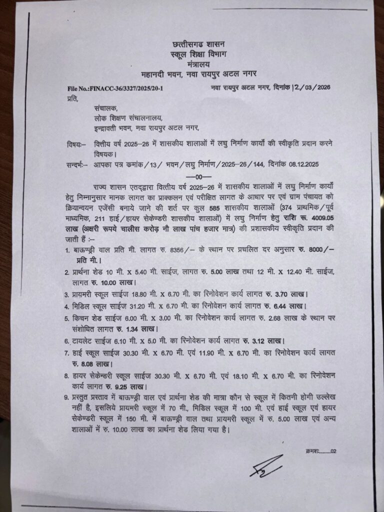 राज्य शासन एतद्वारा वित्तीय वर्ष 2025-26 में शासकीय शालाओं में लघु निर्माण कार्यों हेतु निम्नानुसार क्षेत्र के 10 स्कूलों में आहता एवं 5 स्कूल में मरममत कार्य के लिए 82 लाख 38 हजार के स्वीकृति प्रदान किया गया।