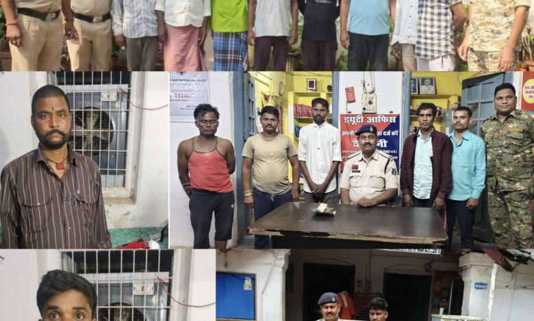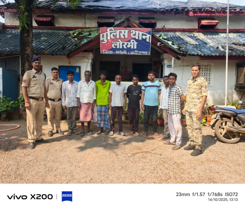 जुआडियान-01 योगेश कुर्रे पिता रामप्रीत उम्र 30 साल 02 प्रदीप कुर्रे पिता बाबूदास उम्र 32 साल 03 विजय कुर्रे पिता गणेश उम्र 46 साल 04 परमेश्वर कुर्रे पिता तिरिच उम्र 20 साल 05. ज्याला प्रसाद पिता झंगलू उम्र 35 साल 06 जलीराम ध्रुव पित्ता तितरा उम्र 42 साल 07 संदीप कुर्रे पिता बाबूदास उम्र 32 साल 08 मधु कुमार रात्रे पिता बीरसिंह उम्र 45 साल साकिनान सेमरिया 09 गोलू कश्यप पिता गंगा उम्र 32 साल साकिन मसना 10 सुनील साहू पिता द्वारिका उम्र 28 साल साकिन पीपरखुंटी 11. चुम्मन साहू पिता पन्ना लाल उम्र 28 साल साकिन कोयलारी 12 शारदा कश्यप पिता दुजराम उम्र 38 साल 13 मुनेश्वर साहू पिता गीताराम उम्र 35 साल साकिनान मसना थाना लोरमी के विरूद्ध क्रमशः अपराध क्रमांक 555/25,556/25,557/25 धारा 3(2) जुआ अधि. के तहत अपराध पंजीबद्ध कर विधिवत कार्यवाही किया गया, एवं पृथक से प्रतिबंधात्मक कार्यवाही कर तहसील न्यायालय लोरमी में पेश किया गया।