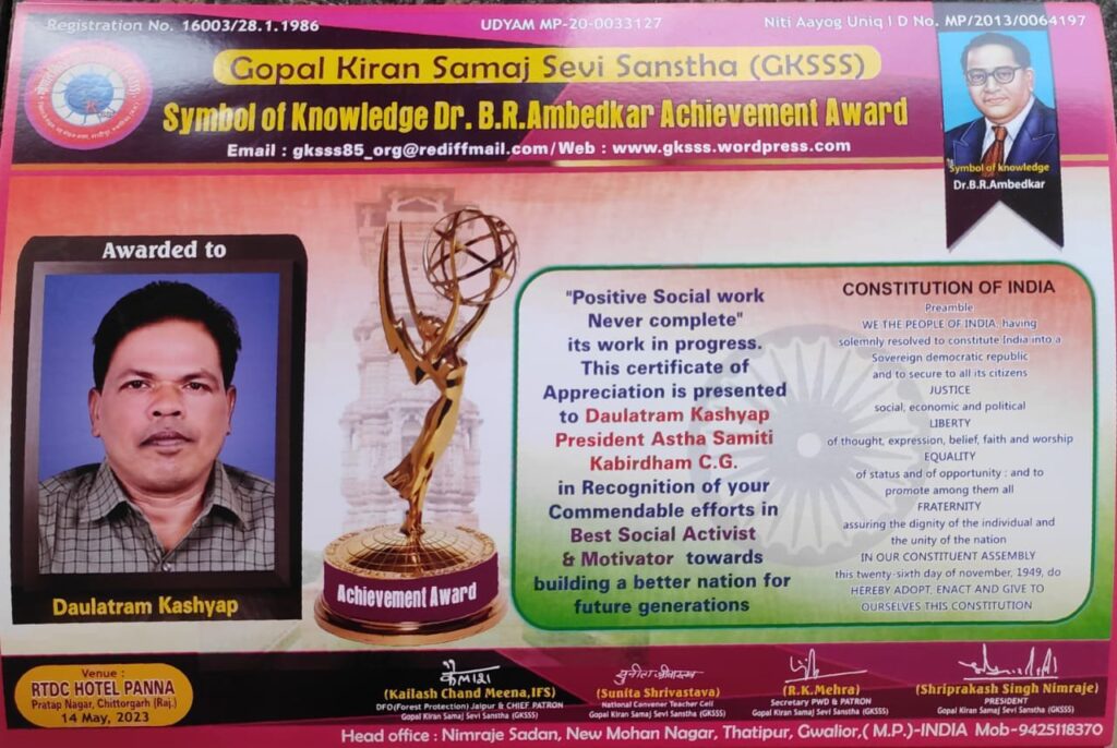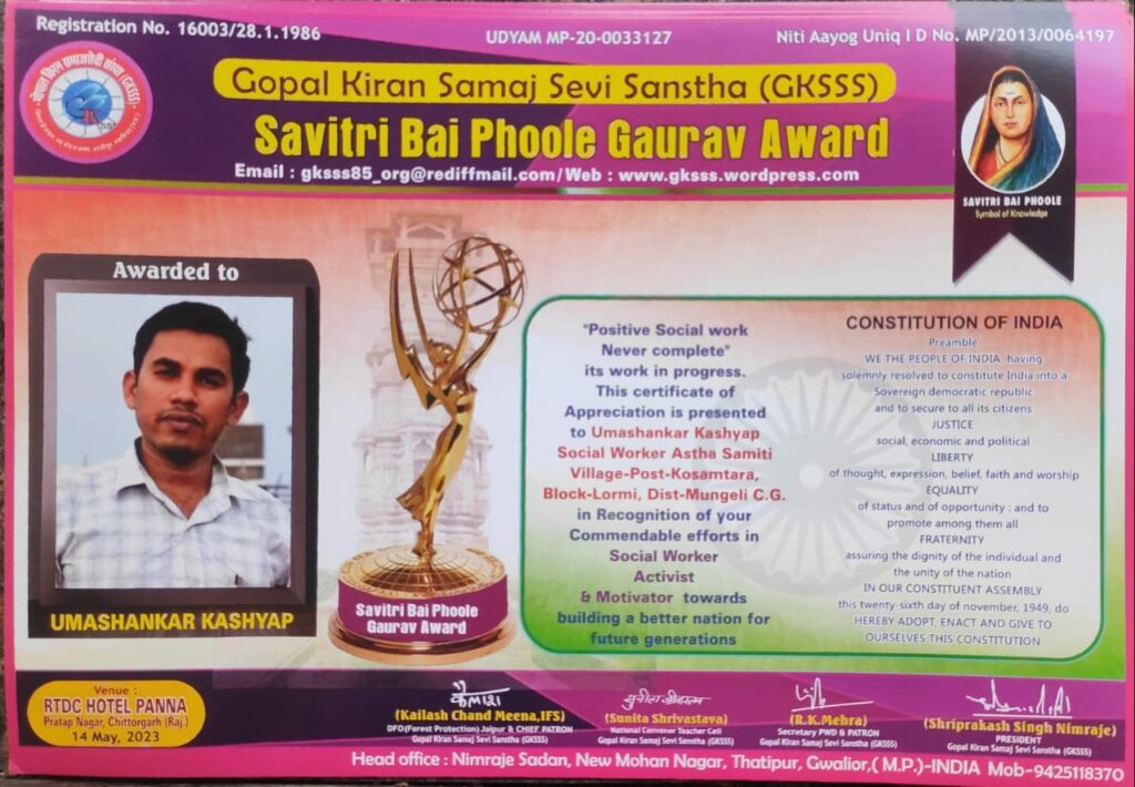 कार्यक्रम के मुख्य अतिथि सम्मानीय डा० बी०पी० अशोक पुलिस अधीक्षक, के०सी० मीणा आईएफएस, अध्यक्षता प्रकाश सिंह निमराजे अध्यक्ष गोपाल किरण संस्था, अति० विशिष्ट अतिथि – इंजी० आर.एस. वर्मा वरिष्ठ उप महाप्रबंधक मेट्रो रेल पुणे, भीम रत्न लखमीचंद्र गौतम अपर सचिव, महिला एवं बाल विकास मंत्रालय नई, संतोष मीणा, रविन्द्र सिंह यादव – आयुक्त नगर परिषद् चितौड़गढ़, शाहना खानम अतिरिक्त पुलिस अधीक्षक अनुसंधान सेल चितौड़गढ़ में उत्कृष्ट कार्य करने वाले छत्तीसगढ़ राज्य के दौलतराम कश्यप अध्यक्ष आस्था समिति को डा० भीमराव आंबेडकर अचीवमेंट अवार्ड, उमाशंकर कश्यप सामाजिक कार्यकर्ता को सावित्रीबाई फुले गौरव अवार्ड एवं मयाराम जायसवाल शिक्षक सावित्रीबाई फुले गौरव अवार्ड सम्मान स्मृति चिन्ह् एवं प्रशस्ति पत्र से सम्मानित किया गया । यह सम्मान समाज के क्षेत्र में उत्कृष्ट कार्य किया जा रहा हैं । छत्तीसगढ़ राज्य के मुंगेली एवं कबीरधाम जिले में बच्चों के क्षेत्र में सुरक्षा एवं पुर्नवास के लिए कार्य किया जा रहा है, शासन के द्वारा संचालित योजनाओं को स्वास्थ्य, शिक्षा, पर्यावरण के बारे में अंतिम छोर विशेष पिछड़ी बैगा जनजाति , स्लम एवं गांवों तक पहुंचा रहे हैं।