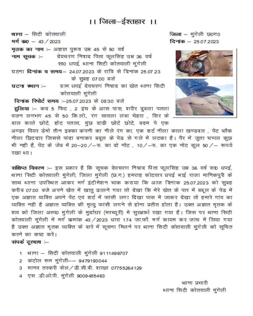 थाना सिटी कोतवाली द्वारा 43/2023 की धारा 174 जा फॉ मर्ग कायम कर मामले की विवेचना में जुट गयी है। पुलिस ने शव का पंचनामा कर जिला अस्पताल मुंगेली मरचूरी में सुरक्षित रखवा गया है। पुलिस ने क्षेत्र में शव की सिनाख्ता के लिये परिजनों का पतासाजी किये लेकिन अभी तक नहीं हो पाई है । मृतक की शव के अज्ञात के शव के पहचान के लिए थाना सीटीकोतवाली द्वारा इश्तहार जारी किया गया है। उक्त के जानकारी मिलने पर थाना सीटिकोट्वाली को सूचनार्थ के लिये अपील किया है।