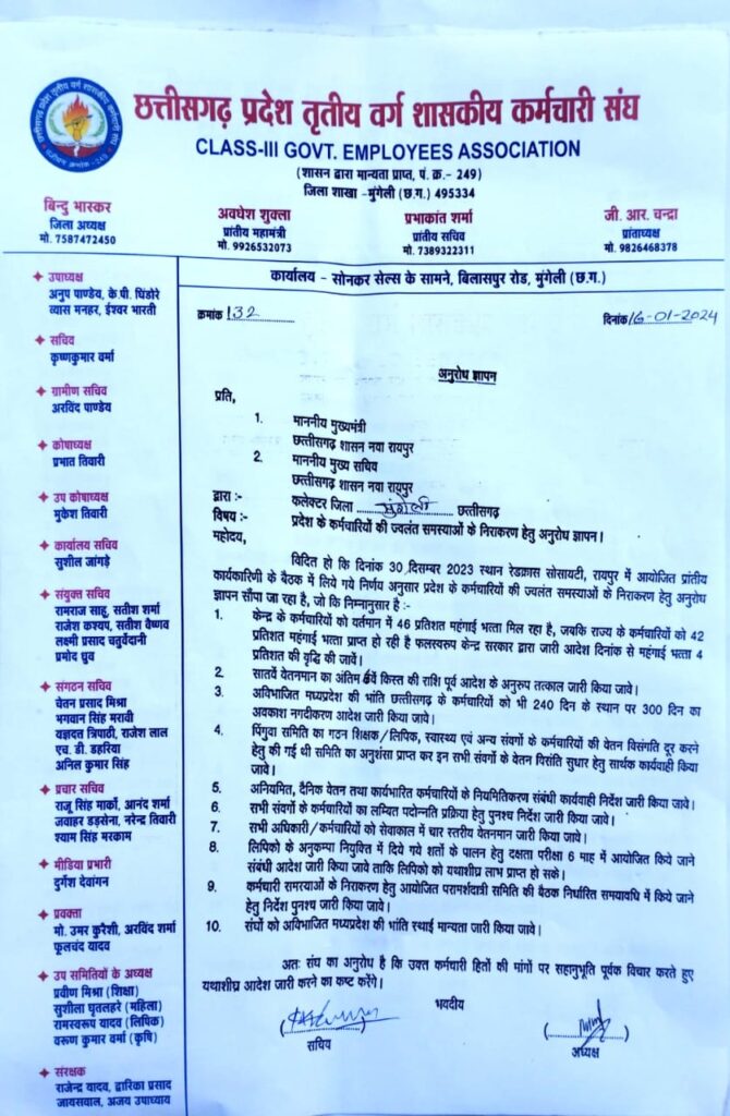 हरिपथ– मुंगेली (जिला सवांद दाता) 16 जनवरी छ ग प्रदेश तृतीय वर्ग शासकीय कर्मचारी संघ जिला शाखा मुंगेली द्वारा प्रदेश के कर्मचारियों की ज्वलंत समस्याओं के निराकरण हेतु मुख्यमंत्री छग शासन एवं मुख्य सचिव छग शासन नया रायपुर को जिला कलेक्टर मुंगेली के माध्यम से ज्ञापन सौंपा गया।